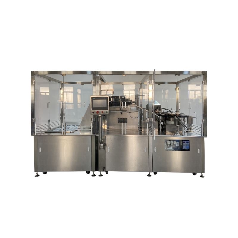 AJ-DZA200预充式注射器灌装旋盖机 适用于各类型预充式注射器,特殊类型的注射器亦可定制。陶瓷柱塞泵实现定量灌装,耐酸碱侵蚀,耐磨耐高温,灌装精度高.盖帽的排序和输送通过振动盘实现,采用SUS316L不锈钢洁净盘,无清洁死角,顶盘可拆卸并支持灭菌。